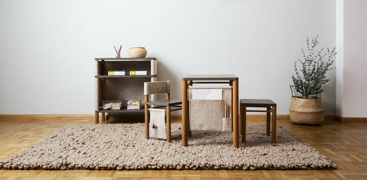 Hocker FÉLIX und Stuhl CLÉMENT kann es von Anfang an selber tragen, Tisch CAMILLE und die Regale VICTOR und THÉO sind auch den kindlichen Bedürfnissen in Bezug auf Größe, Gewicht und Umgang perfekt angepasst.